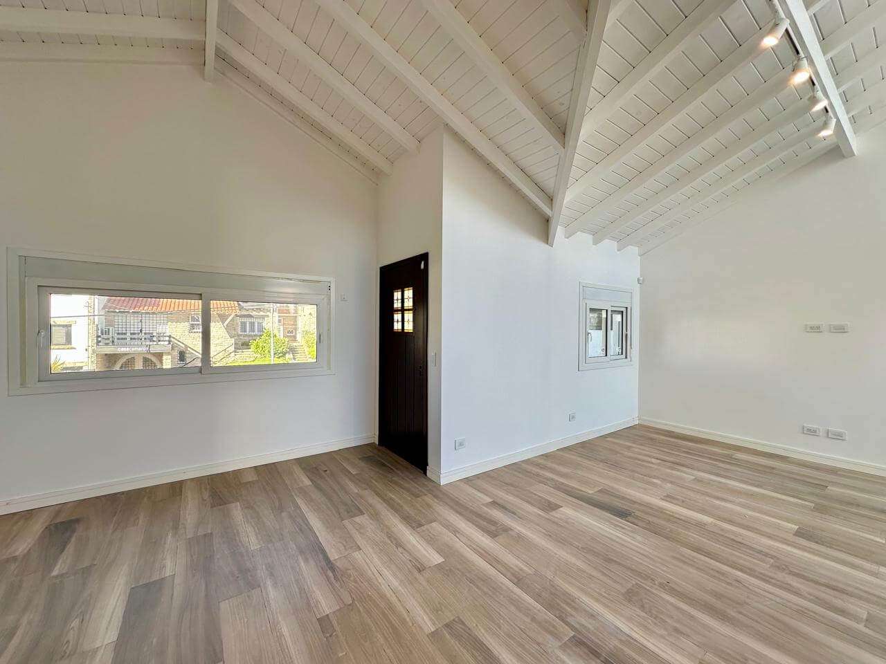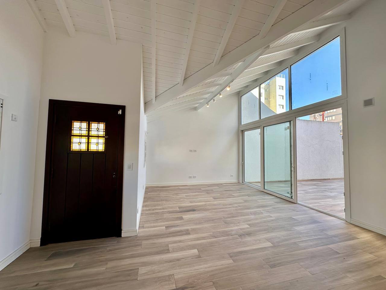 Al ingresar nos recibe un amplio living comedor de generosas dimensiones, con múltiples ventanas a la calle, gran ventanal con salida al patio y una impactante ventana en doble altura que aporta luz natural y jerarquía al ambiente. Techos blancos de madera a la vitsa.