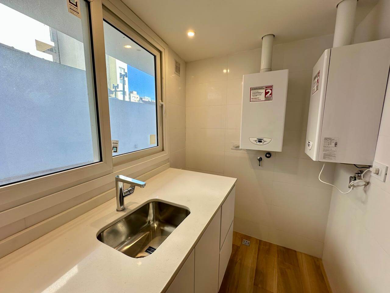 Lavadero independiente con ventanal al patio y gran placard de guardado. Aquí se encuentran las dos calderas individuales Ariston (una para agua caliente y otra para calefacción por losa radiante).