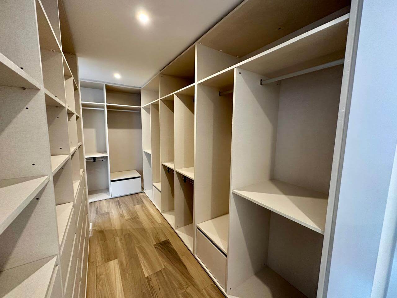 Dormitorio principal en planta baja, con gran vestidor hecho a medida, baño en suite compartimentado y salida directa al patio mediante puerta corrediza.