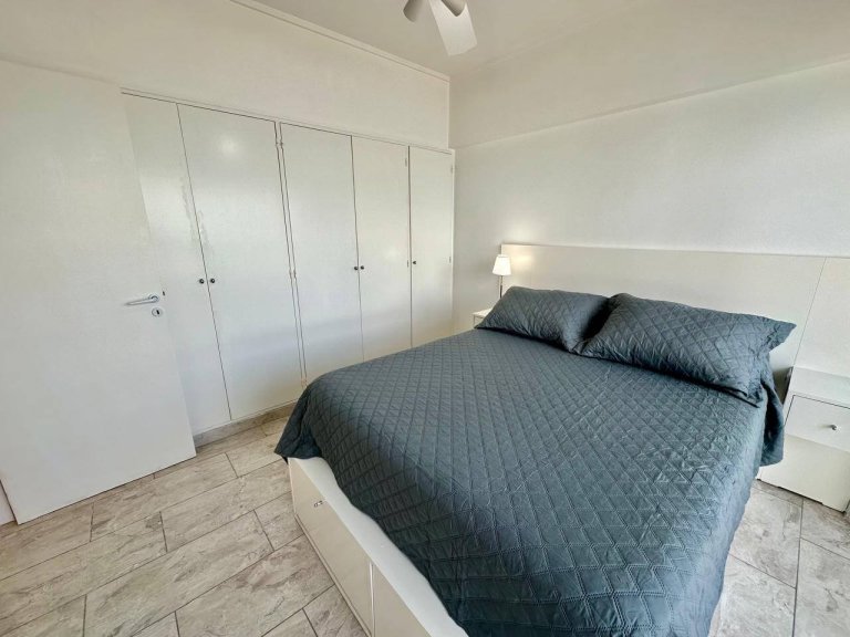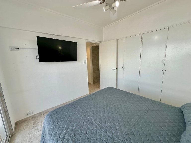 Dormitorio con cama matrimonial, placard, TV con cable común y ventilador de techo. Acceso a balcón con vistas panorámicas y al mar.