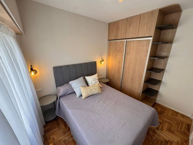 Dormitorio con placard empotrado, somier de dos plazas con respaldo.