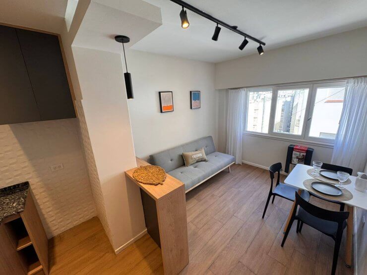 Living comedor con amplio ventanal, muy luminoso, amoblado con juego de mesa y sillas, futón y calefactor con tiro balanceado.