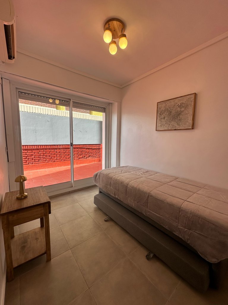 - Segundo dormitorio al lateral (3 x 2,6 m) con salida al balcón terraza, split frío/calor y baño en suite revestido en porcelanato (1,6 x 1,3 m).