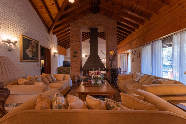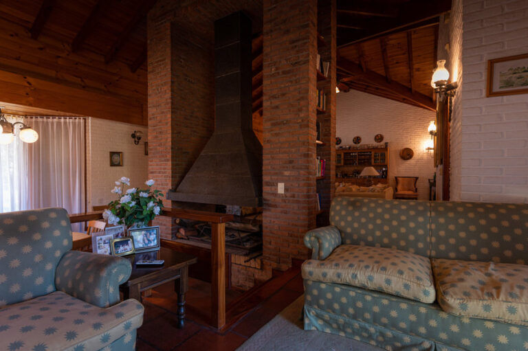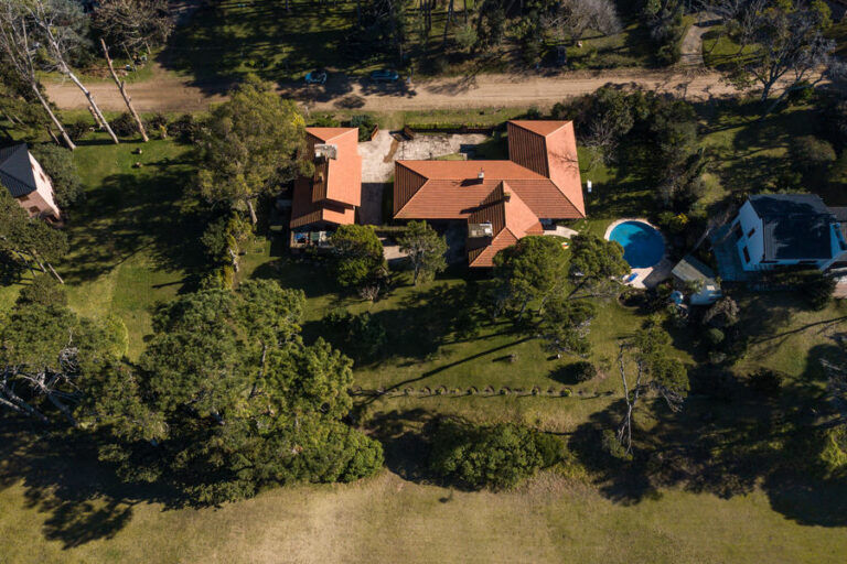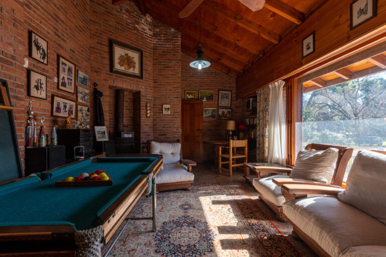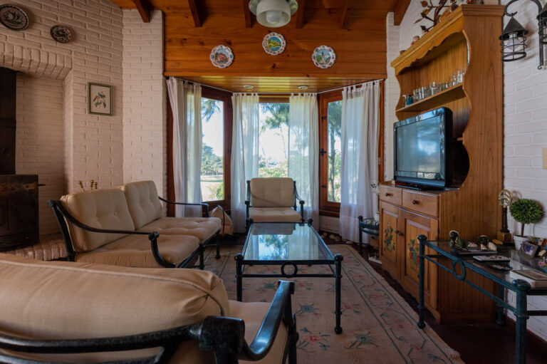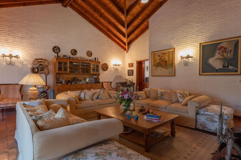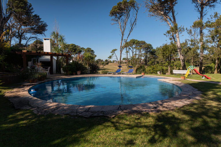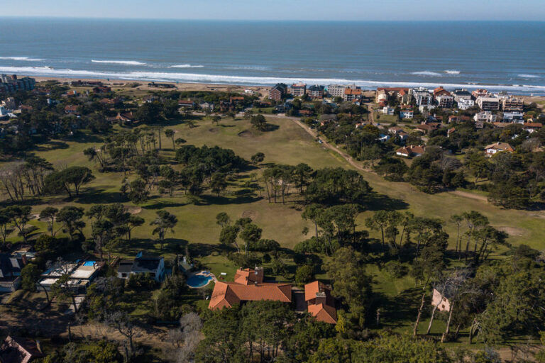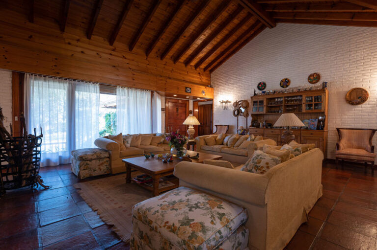 La propiedad también cuenta con una casa para caseros completamente equipada, una cochera cubierta para dos vehículos, área de lavandería y vestuarios externos. Para momentos de entretenimiento, un playroom con otra chimenea de leña aguarda. Pero el verdadero distintivo se encuentra en la piscina, que ofrece una vista sin igual del campo de golf, complementada por un horno de barro y una amplia galería expuesta al pleno sol.