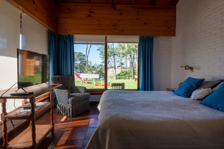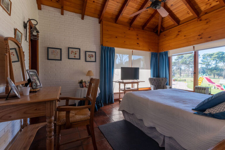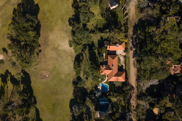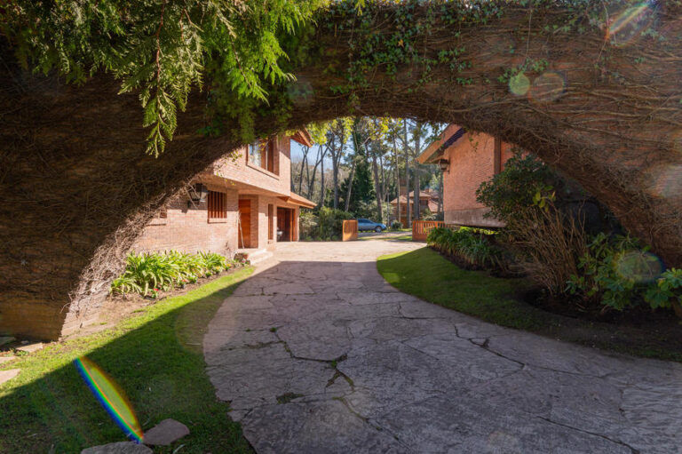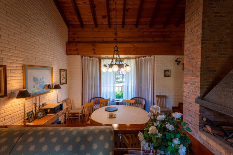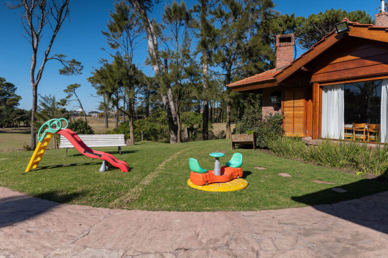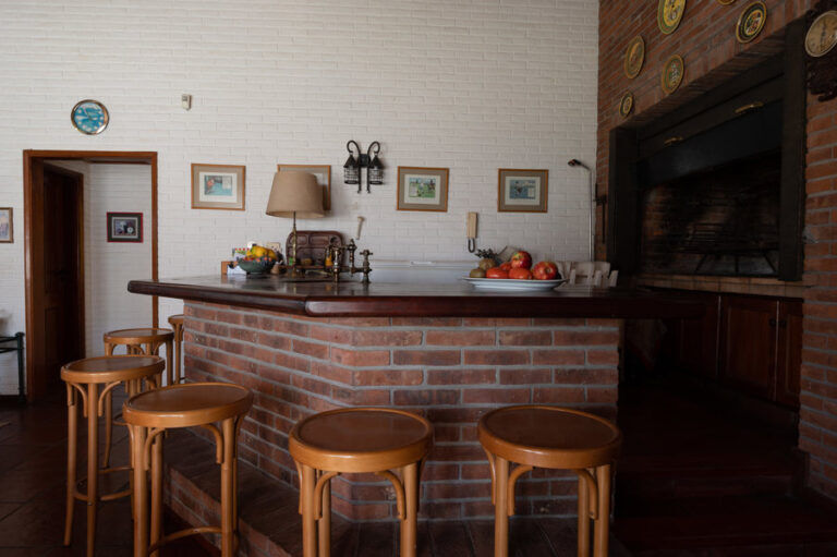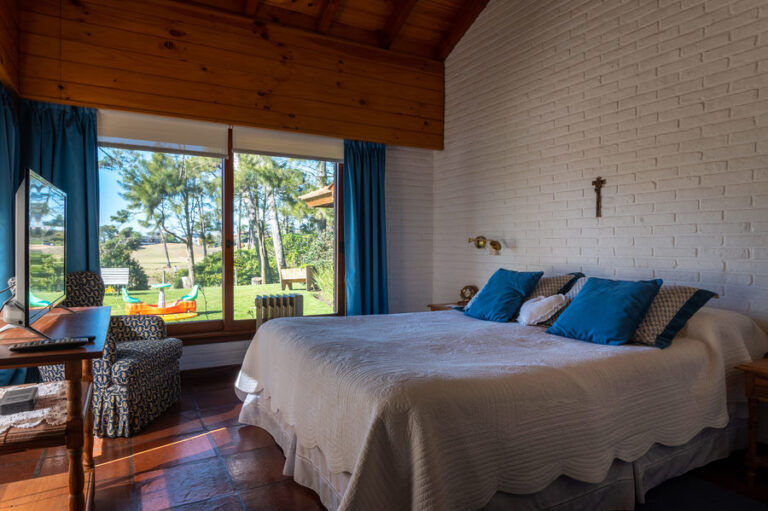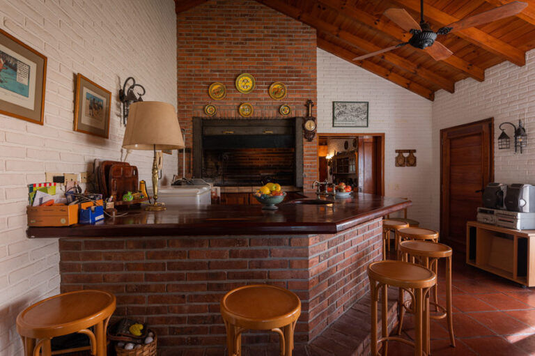 La propiedad también cuenta con una casa para caseros completamente equipada, una cochera cubierta para dos vehículos, área de lavandería y vestuarios externos. Para momentos de entretenimiento, un playroom con otra chimenea de leña aguarda. Pero el verdadero distintivo se encuentra en la piscina, que ofrece una vista sin igual del campo de golf, complementada por un horno de barro y una amplia galería expuesta al pleno sol.