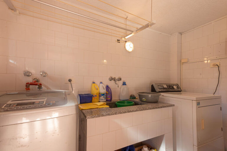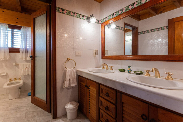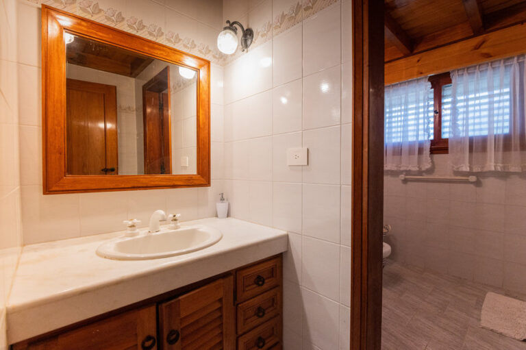 La distribución interior se organiza en dos alas. La primera alberga un dormitorio principal en suite, con dos vestidores y una vista panorámica que conquista los sentidos. Dos habitaciones adicionales, una con cama matrimonial y la otra con tres camas individuales, comparten una vista serena hacia la piscina y el parque circundante. Un baño completo culmina esta ala con elegancia funcional.